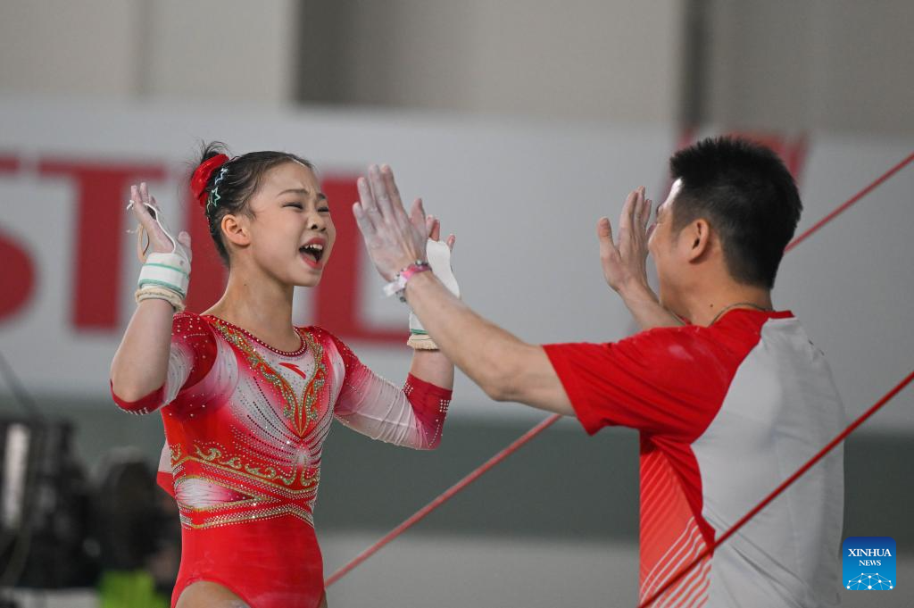 Yang Fanyuwei (L) of China celebrates with her coach during the women's uneven bars final at the FIG Artistic Gymnastics Apparatus World Cup 2025 in Antalya, Türkiye, March 22, 2025. (Xinhua/Liu Lei)