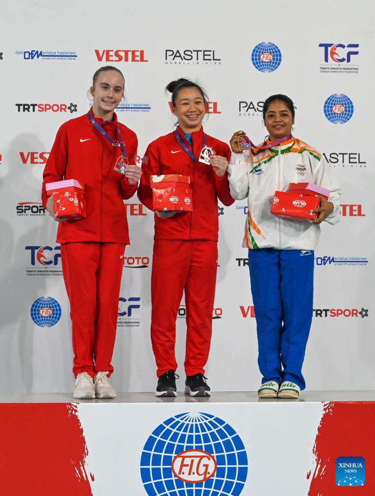 Gold medalist Jayla Hang (C) of the United States, silver medalist Claire Pease (L) of the United States and bronze medalist Pranati Nayak of India pose during the awarding ceremony after the women's vault final at the FIG Artistic Gymnastics Apparatus World Cup 2025 in Antalya, Türkiye, March 22, 2025. (Xinhua/Liu Lei)
