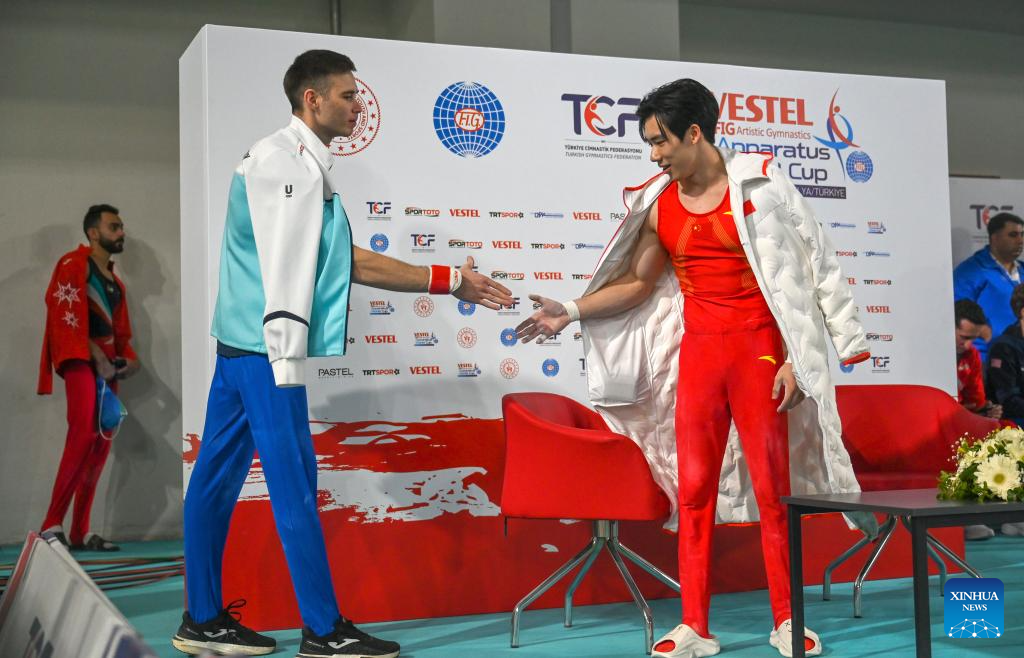 Zhang Boheng (R) of China greets Nariman Kurbanov of Kazakhstan after the men's pommel horse final at the FIG Artistic Gymnastics Apparatus World Cup 2025 in Antalya, Türkiye, March 22, 2025. (Xinhua/Liu Lei)