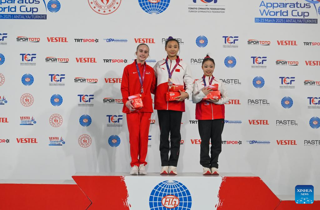 Gold medalist Yang Fanyuwei (C) of China, silver medalist Claire Pease (L) of the United States and bronze medalist Tian Zhuofan of China pose during the awarding ceremony after the women's uneven bars final at the FIG Artistic Gymnastics Apparatus World Cup 2025 in Antalya, Türkiye, March 22, 2025. (Xinhua/Liu Lei)