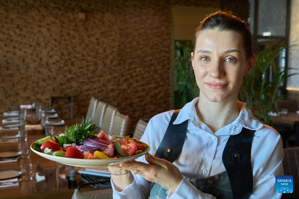 A restaurant waitress holds a plate of salad made of vegetables imported from China in Blagoveshchensk, Russia, March 21, 2025. The Russian city of Blagoveshchensk faces China's Heihe City across the Heilongjiang River, known in Russia as the Amur River. Recent years the two cities have witnessed active economic and trade exchanges.