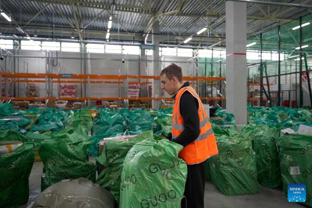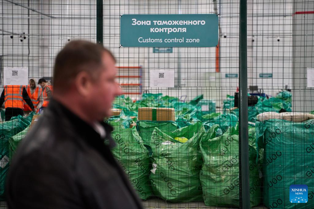 A worker processes goods from China at a warehouse in the Kanikurgan Customs and Logistics Terminal in Blagoveshchensk, Russia, March 21, 2025. The Russian city of Blagoveshchensk faces China's Heihe City across the Heilongjiang River, known in Russia as the Amur River. Recent years the two cities have witnessed active economic and trade exchanges.