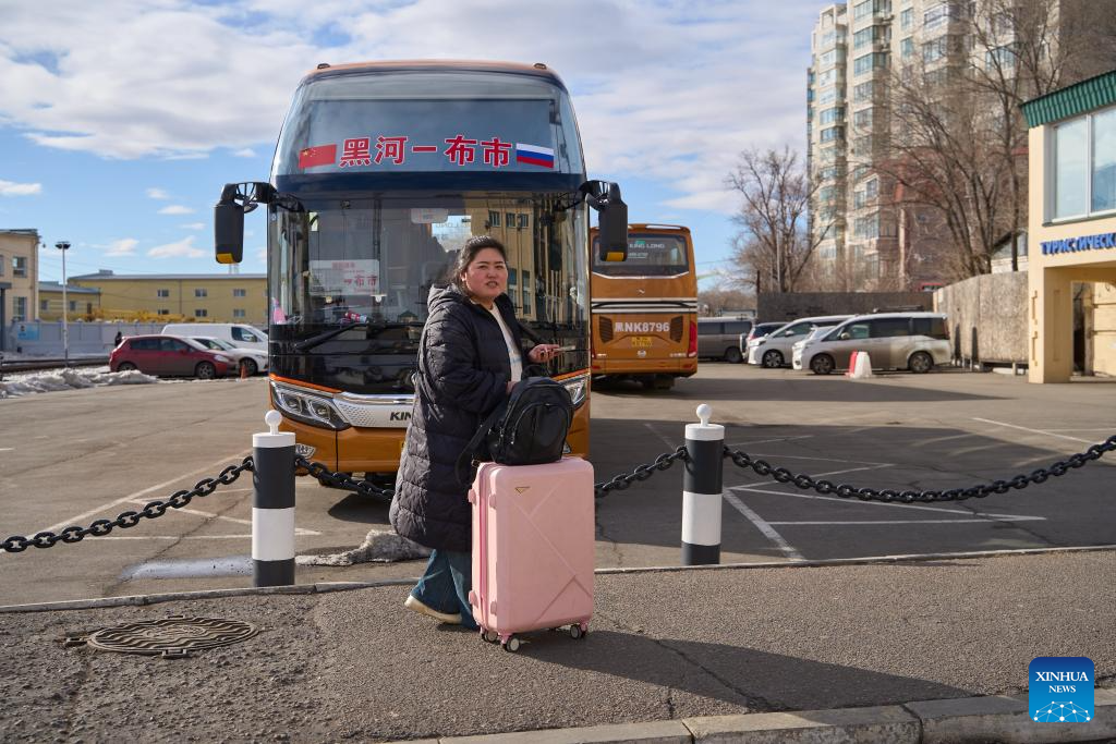 A coach waits for passengers heading for Heihe City of northeast China's Heilongjiang Province, in Blagoveshchensk, Russia, March 21, 2025. The Russian city of Blagoveshchensk faces China's Heihe City across the Heilongjiang River, known in Russia as the Amur River. Recent years the two cities have witnessed active economic and trade exchanges.