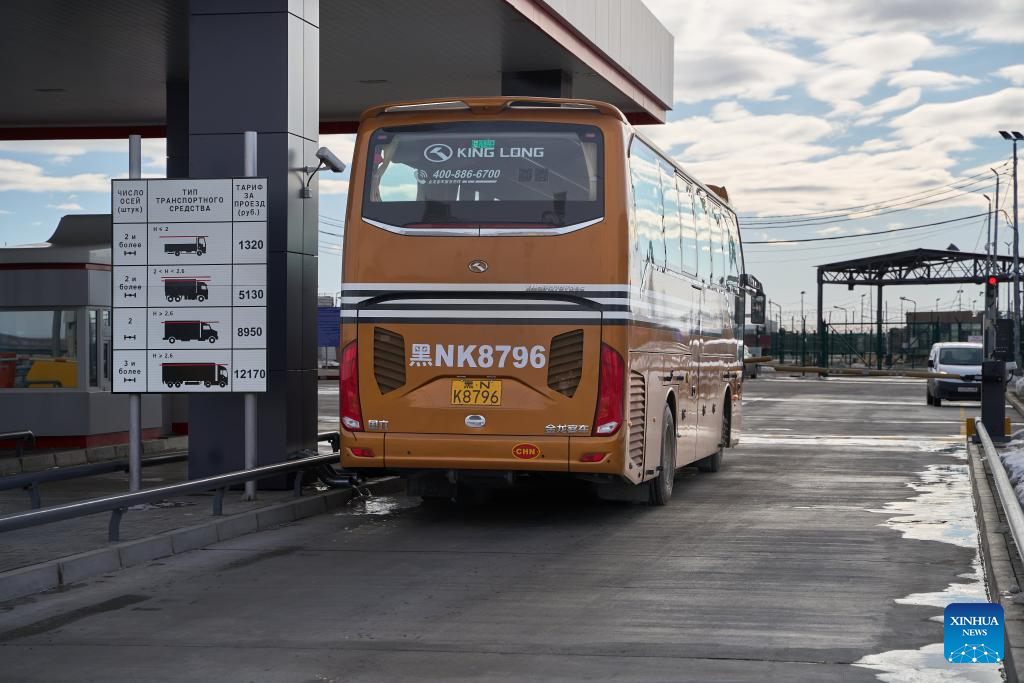 A Chinese bus passes through the border toll station between China and Russia on the bridge along Heihe-Blagoveshchensk highway on March 21, 2025. The Russian city of Blagoveshchensk faces China's Heihe City across the Heilongjiang River, known in Russia as the Amur River. Recent years the two cities have witnessed active economic and trade exchanges.