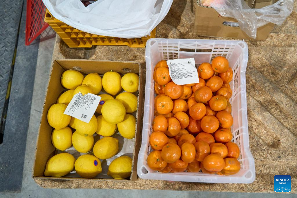 Fruits from China wait for sampling at the Kanikurgan Customs and Logistics Terminal in Blagoveshchensk, Russia, March 21, 2025. The Russian city of Blagoveshchensk faces China's Heihe City across the Heilongjiang River, known in Russia as the Amur River. Recent years the two cities have witnessed active economic and trade exchanges.