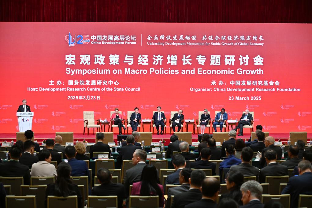 This photo taken on March 23, 2025 shows the Symposium on Macro Policies and Economic Growth of the China Development Forum 2025 in Beijing, capital of China. The China Development Forum 2025 is scheduled from March 23 to 24. The theme of this year's forum is "Unleashing Development Momentum for Stable Growth of Global Economy." (Xinhua/Li Xin)