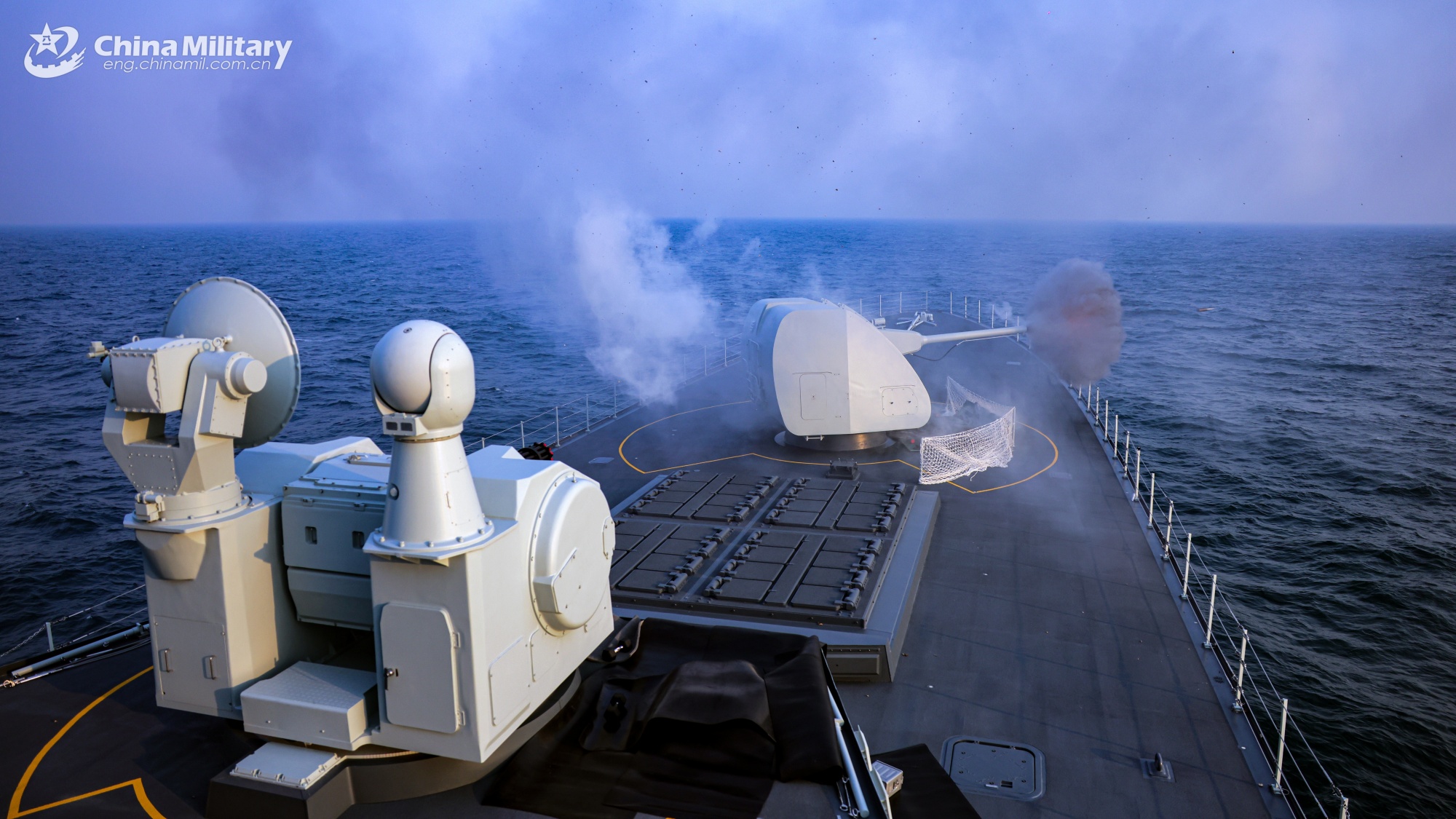 The photo shows the Chinese PLA Navy's first Type 054B guided-missile frigate Luohe (Hull 545) firing its main gun at simulated targets during a recent maritime combat training in the designated sea area of China's Yellow Sea.