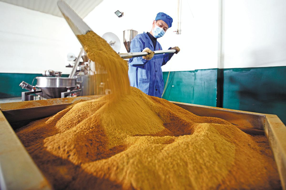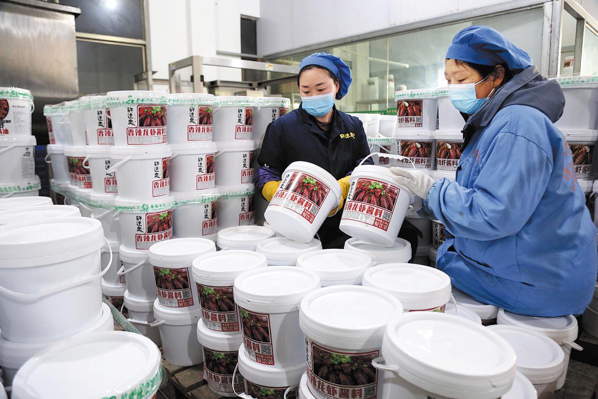 A worker processes flavoring paste for cooking crayfish at a factory in Xuyi on March 8. (Gu Binfu/Xinhua)