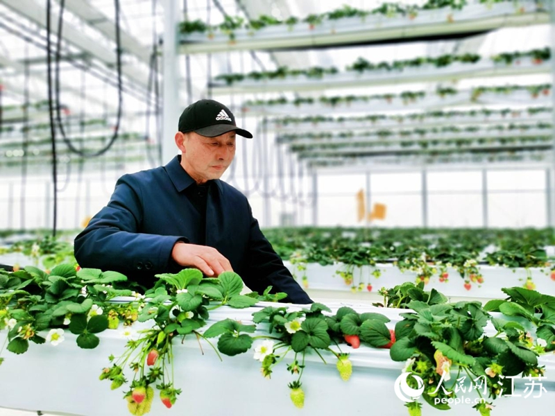 Chen Zhenghai checks the growth of strawberries in a greenhouse of a modern agricultural industry demonstration park in Xinmin village, Yandu district, Yancheng city of east China's Jiangsu Province. (People's Daily Online/Zhou Mengjiao)