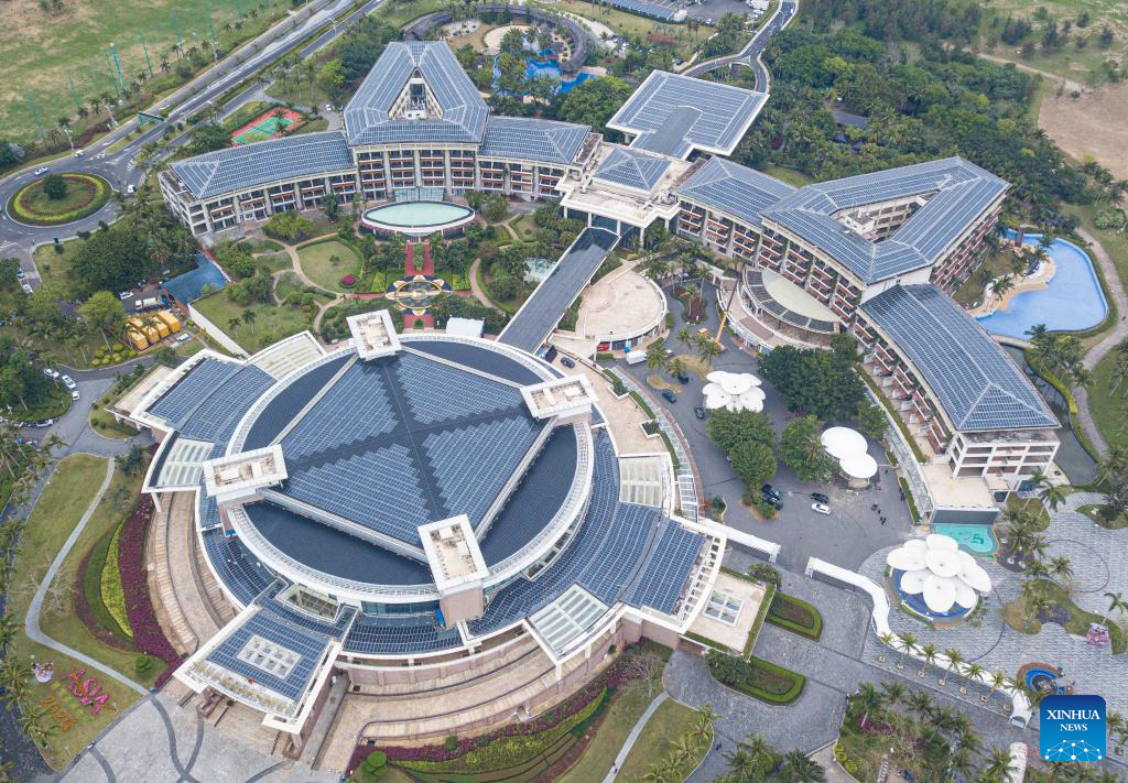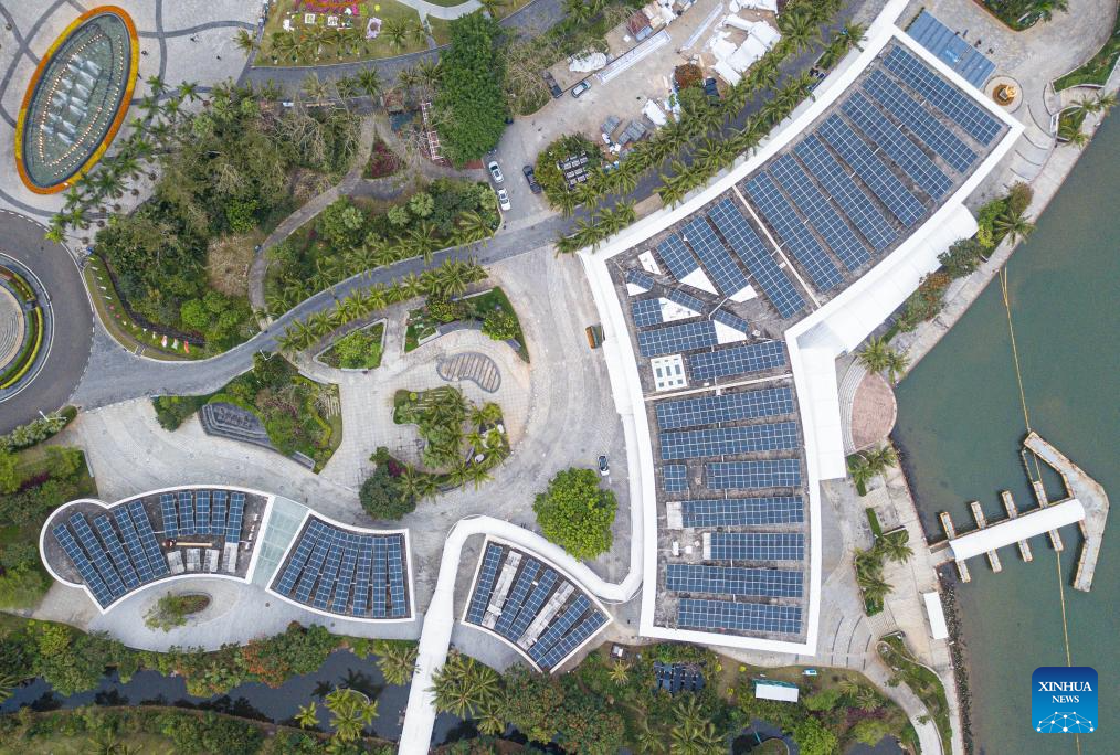An aerial drone photo taken on March 16, 2025 shows the photovoltaic devices on the roof of the Boao Forum for Asia (BFA) International Conference Center and a BFA hotel in the Boao zero-carbon demonstration zone in Boao, south China's Hainan Province. China's Boao has announced the establishment of its first zero-carbon zone, a significant step forward in the country's pursuit of low-carbon development, according to authorities in Hainan.(Xinhua/Pu Xiaoxu)