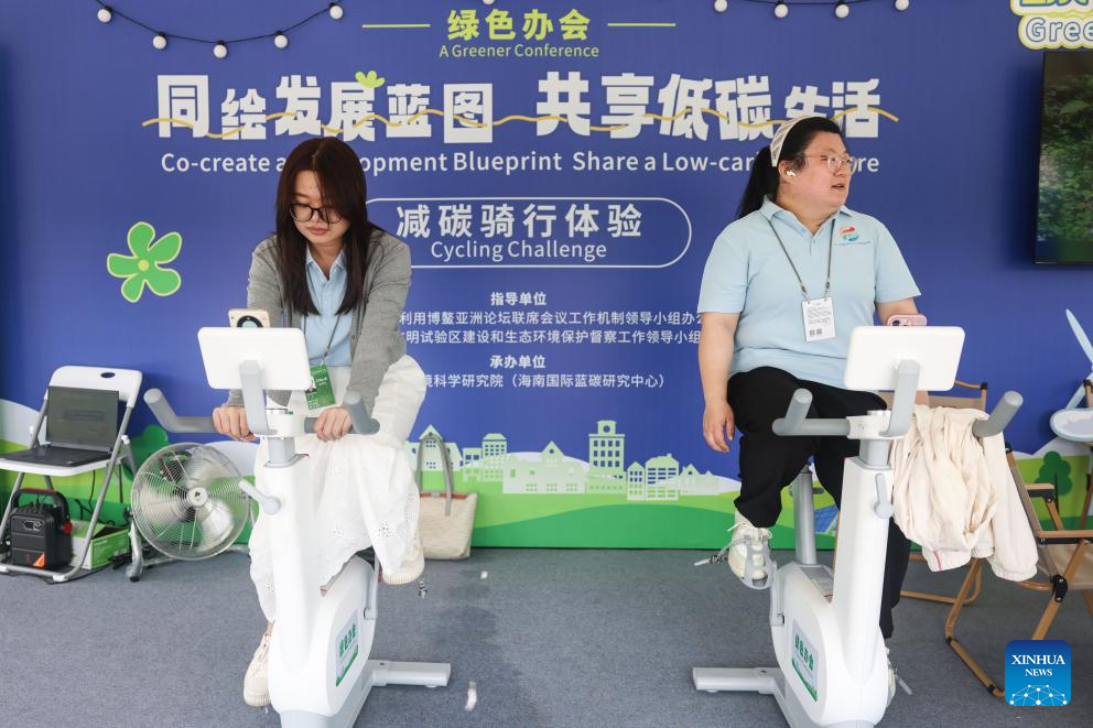 People experience a cycling challenge at a park on Dongyu Island in Boao, south China's Hainan Province, March 25, 2025. China's Boao has announced the establishment of its first zero-carbon zone, a significant step forward in the country's pursuit of low-carbon development, according to authorities in Hainan. (Xinhua/Zhang Liyun)
