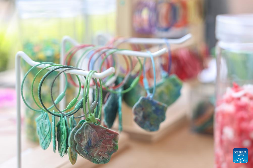 This photo taken on March 25, 2025 shows keychains made from recycled materials being displayed at a zero-carbon rest area for the Boao Forum for Asia (BFA) in Boao, south China's Hainan Province. China's Boao has announced the establishment of its first zero-carbon zone, a significant step forward in the country's pursuit of low-carbon development, according to authorities in Hainan. (Xinhua/Zhang Liyun)