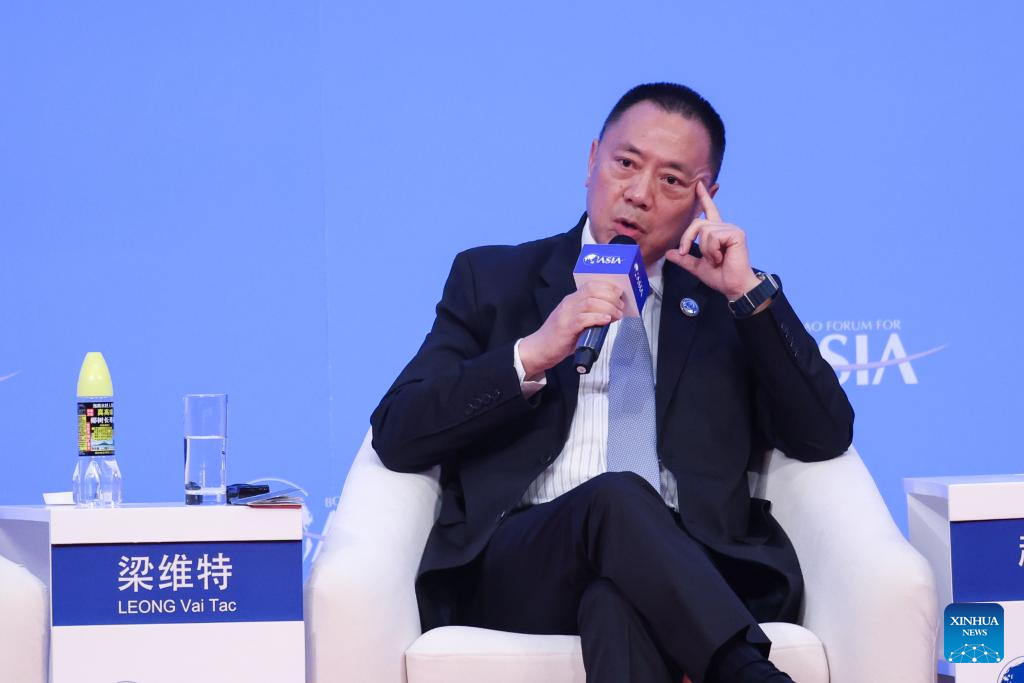 Lionel Leong Vai Tac, member of Council of Advisors of Boao Forum for Asia (BFA), executive chairman of International Science, Technology and Innovation Forum of the BFA, and chairman of Macao Committee for Guangdong-Hong Kong-Macao Greater Bay Area Development of the BFA, speaks at a panel discussion themed on "Global Free Trade Port Development" during the BFA Annual Conference 2025 in Boao, south China's Hainan Province, March 25, 2025. (Xinhua/Zhang Liyun)