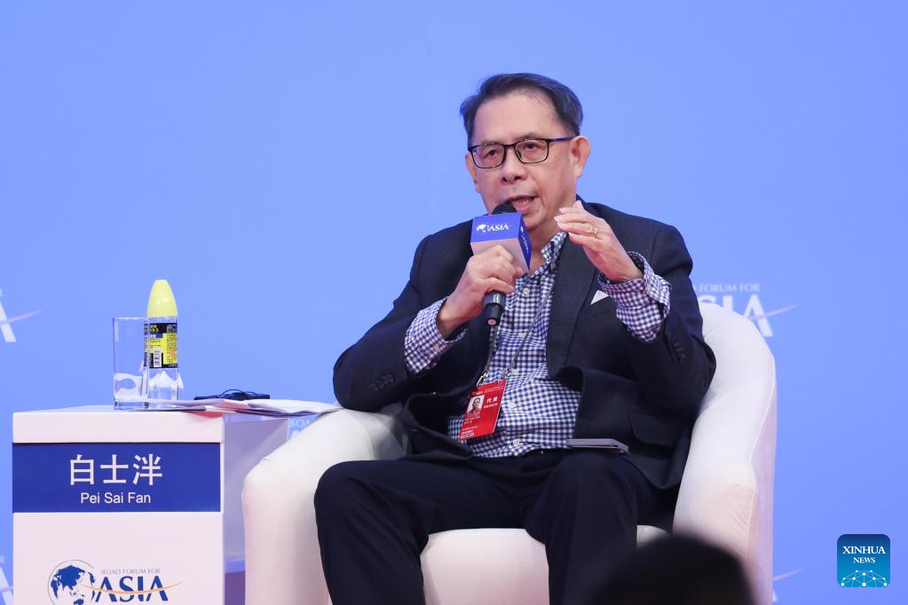 Pei Sai Fan, adjunct professor of National University of Singapore and Nanyang Technological University, and Former Founding Director of MAS Academy of Singapore, speaks at a panel discussion themed on "Global Free Trade Port Development" during the Boao Forum for Asia (BFA) Annual Conference 2025 in Boao, south China's Hainan Province, March 25, 2025. (Xinhua/Zhang Liyun)