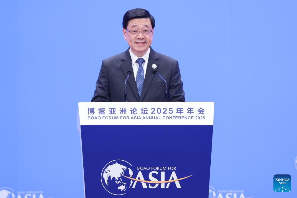 John Lee, chief executive of the Hong Kong Special Administrative Region (HKSAR), delivers a speech at a panel discussion themed on "Global Free Trade Port Development" during the Boao Forum for Asia (BFA) Annual Conference 2025 in Boao, south China's Hainan Province, March 25, 2025. (Xinhua/Zhang Liyun)