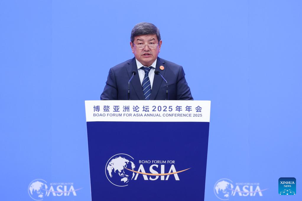 Akylbek Zhaparov, former chairman of the Cabinet of Ministers of the Kyrgyz Republic, speaks at a panel discussion themed on "Global Free Trade Port Development" during the Boao Forum for Asia (BFA) Annual Conference 2025 in Boao, south China's Hainan Province, March 25, 2025. (Xinhua/Zhang Liyun)