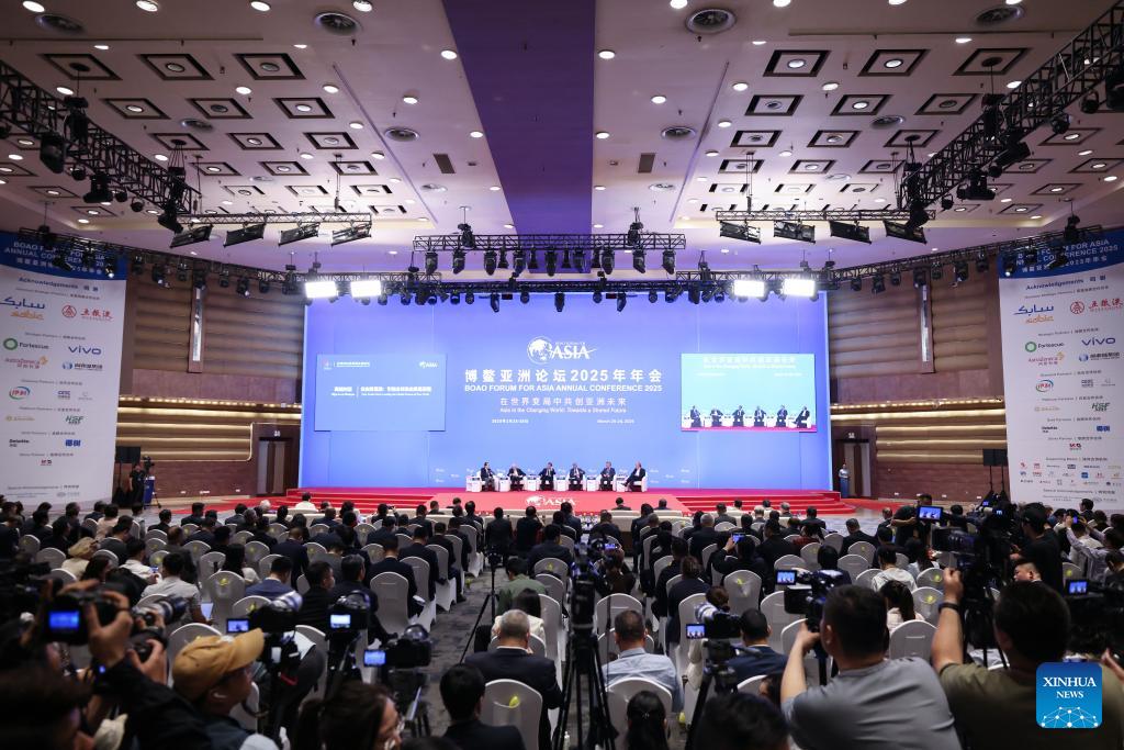 A panel discussion themed on "Global Free Trade Port Development" is held during the Boao Forum for Asia (BFA) Annual Conference 2025 in Boao, south China's Hainan Province, March 25, 2025. (Xinhua/Liu Hongxia)
