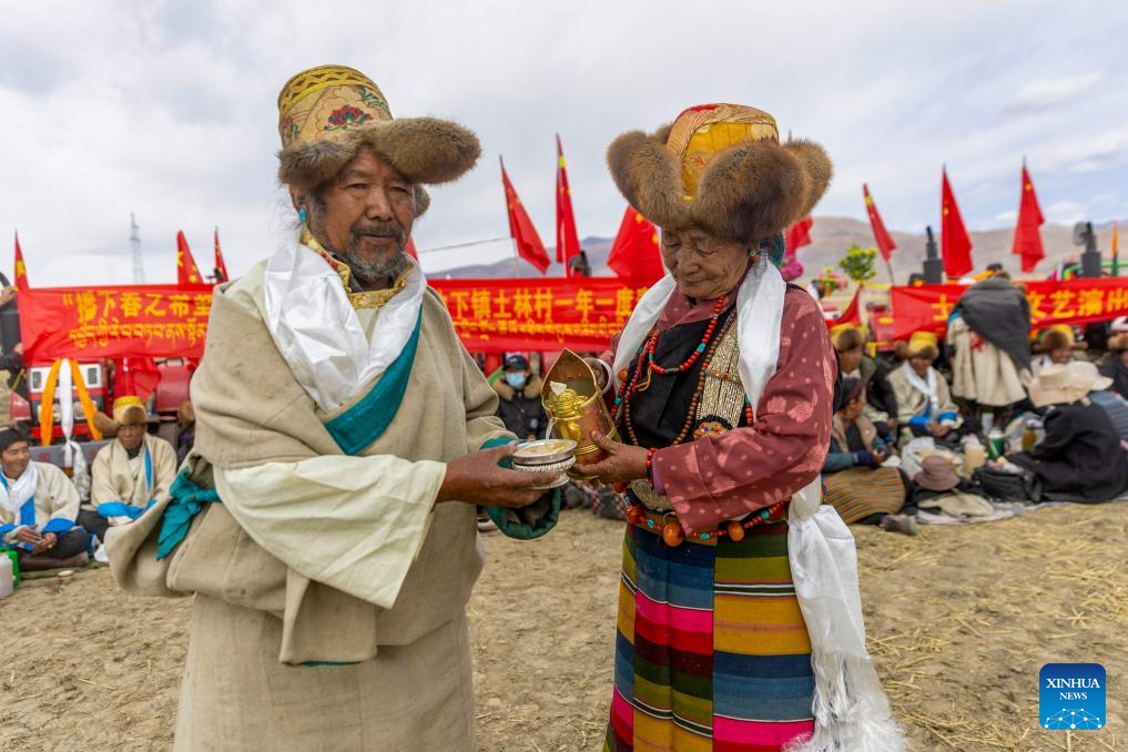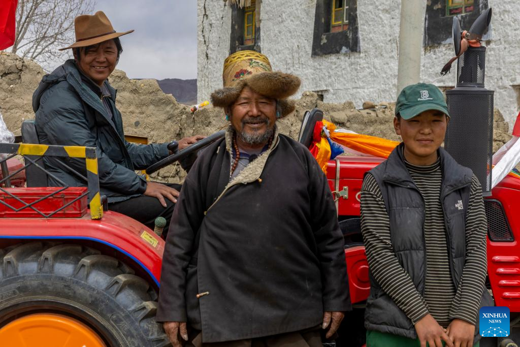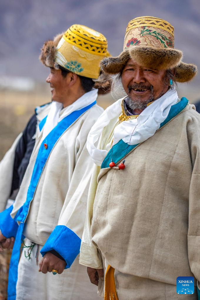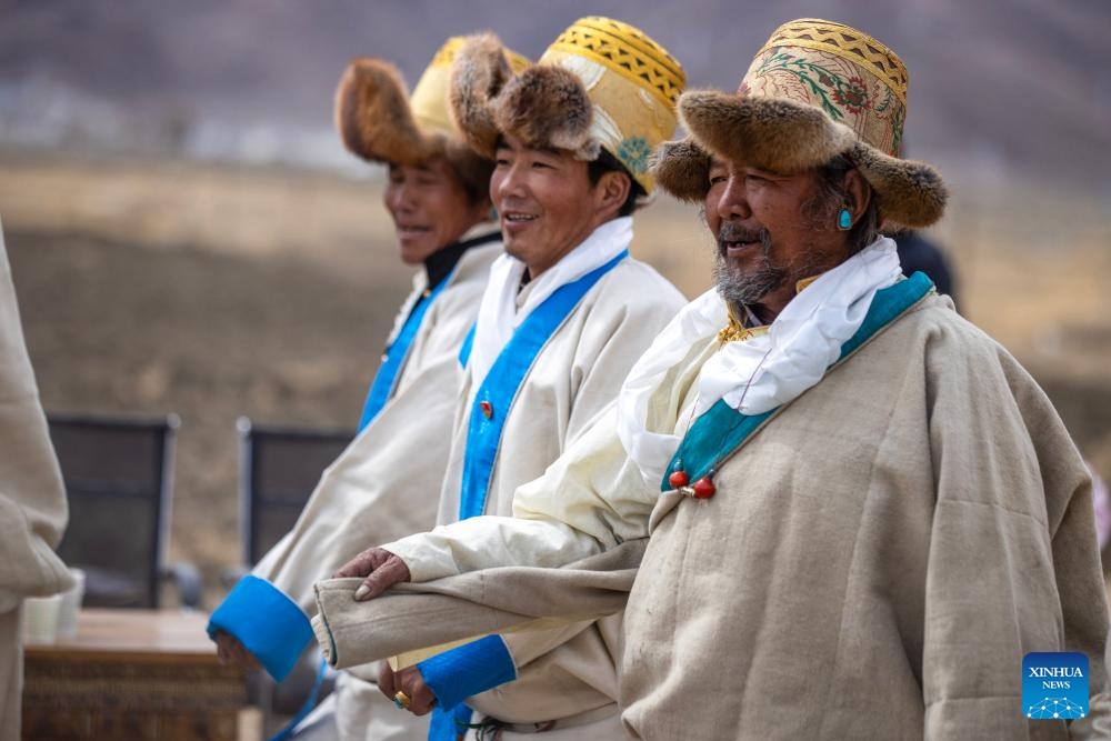 Nyima (R) attends a ceremony marking the start of spring farming in Quxar Town of Lnaze County, southwest China's Xizang Autonomous Region, March 16, 2025. (Xinhua/Jiang Fan)