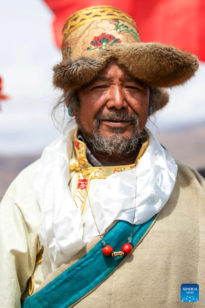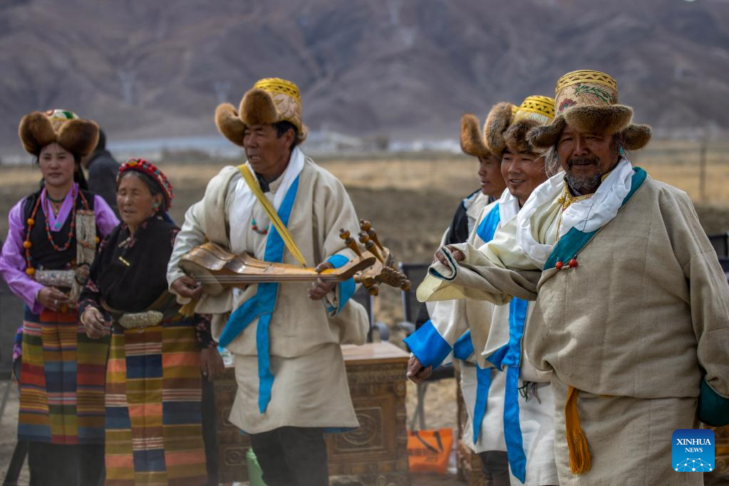 Nyima, as an elder in the village, sings songs of blessings for a prosperous harvest at a ceremony marking the start of spring farming in Quxar Town of Lnaze County, southwest China's Xizang Autonomous Region, March 16, 2025. (Xinhua/Jiang Fan)
