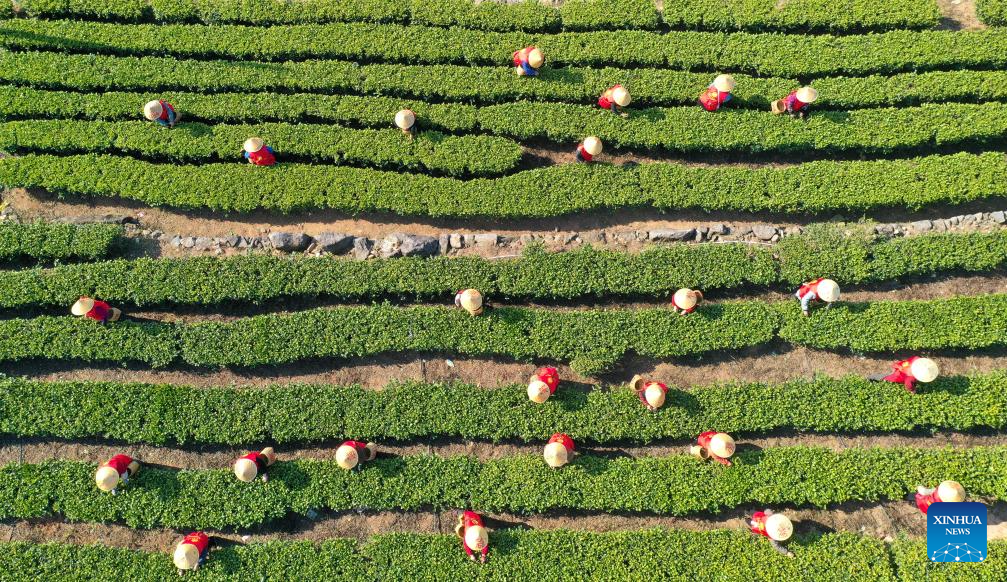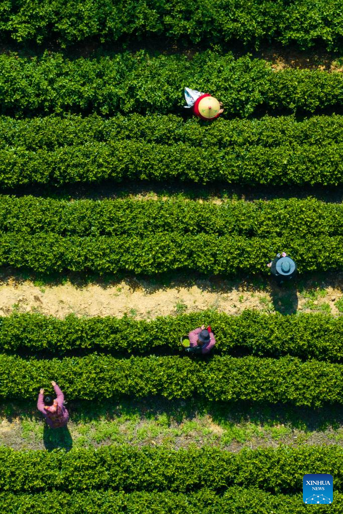 An aerial drone photo taken on March 20, 2025 shows farmers picking tea leaves at a tea garden in Maoao Village of Cicheng Town, Ningbo City, east China's Zhejiang Province. Harvest season of the spring tea has arrived in Zhejiang, one of the major tea-growing areas in China. Farmers are busy harvesting tea leaves ahead of the Qingming Festival to produce the Mingqian (literally "pre-Qingming") tea, which are made of the very first tea sprouts in spring and considered to be of high quality. (Xinhua/Jiang Han)