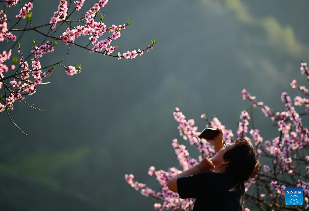 A visitor takes photos of flowers at Shitan Village in Shexian County, Huangshan City of east China's Anhui Province, March 25, 2025. (Xinhua/Zhou Mu)