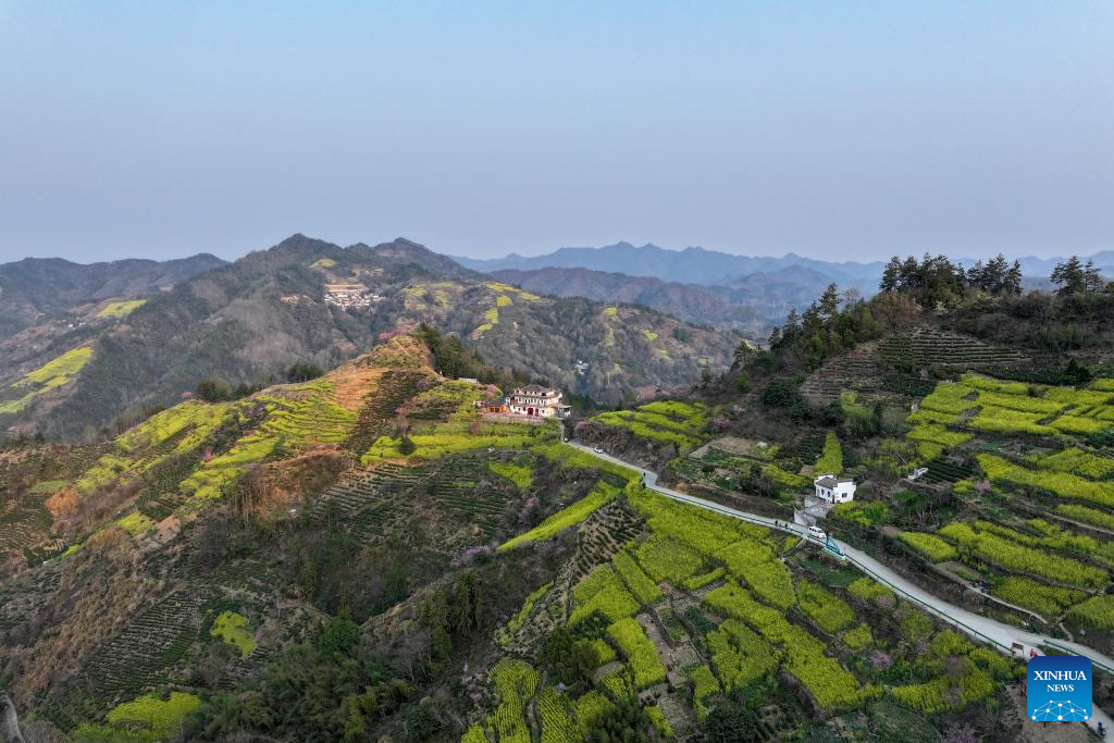 A drone photo taken on March 26, 2025 shows the spring scenery at Shitan Village in Shexian County, Huangshan City of east China's Anhui Province. (Photo by Fan Chengzhu/Xinhua)