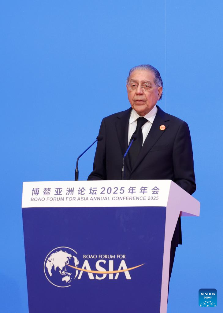 Munir Akram, permanent representative of Pakistan to the United Nations, speaks at a high-level dialogue themed on "Global Governance after the UN Summit of the Future" during the Boao Forum for Asia (BFA) Annual Conference 2025 in Boao, south China's Hainan Province, March 26, 2025. (Xinhua/Du Xiaoyi)