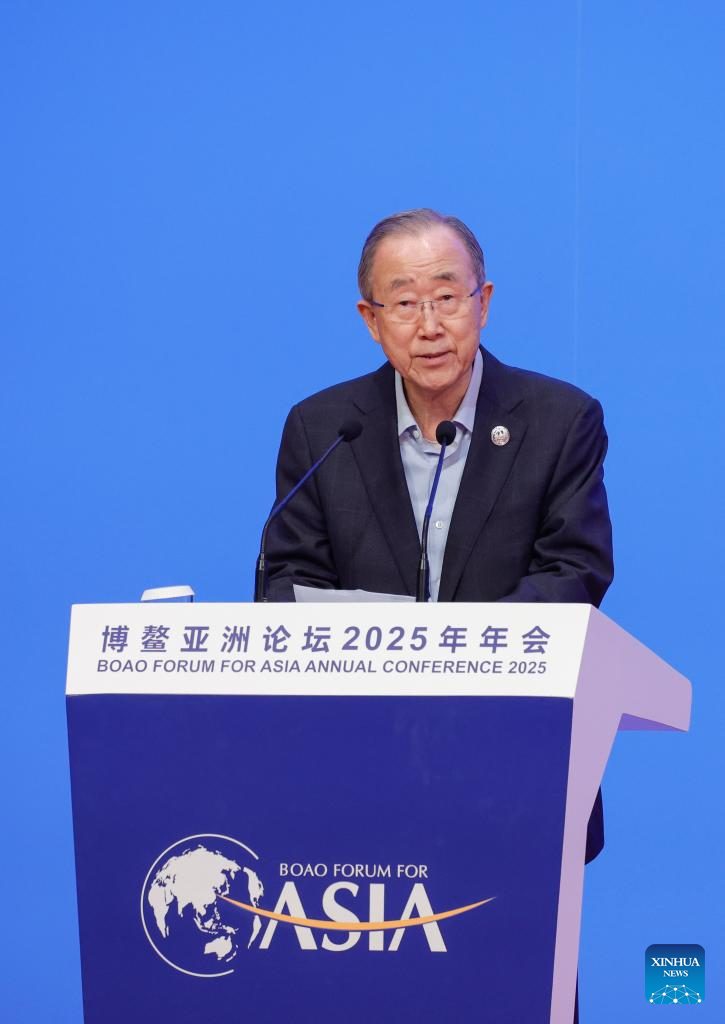 Ban Ki-moon, chairman of Boao Forum for Asia (BFA) and former secretary-general of the United Nations, speaks at a high-level dialogue themed on "Global Governance after the UN Summit of the Future" during the Boao Forum for Asia (BFA) Annual Conference 2025 in Boao, south China's Hainan Province, March 26, 2025. (Xinhua/Du Xiaoyi)
