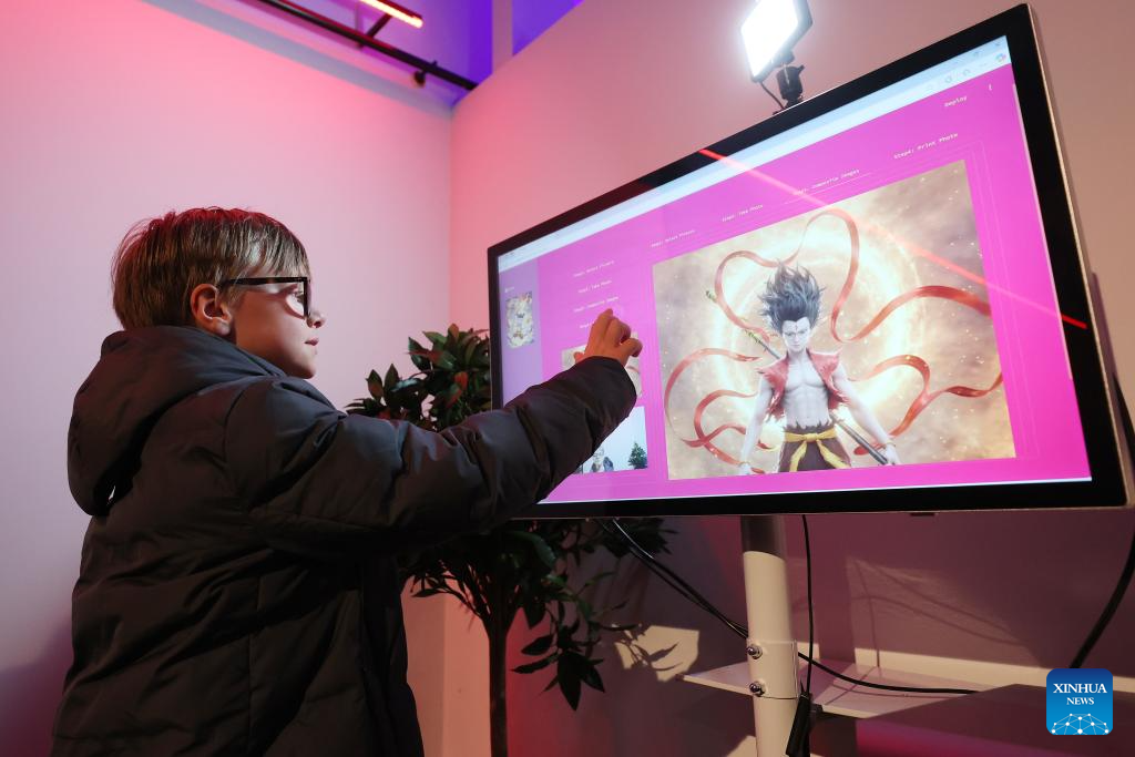 A boy plays a game at the Belgian premiere of Chinese animated film Ne Zha 2 in Brussels, Belgium, March 26, 2025. (Xinhua/Zhao Dingzhe)
