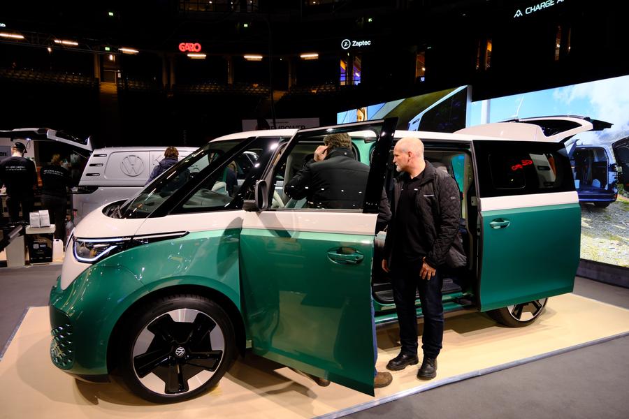 People look at an electric vehicle of Volkswagen at the Swedish eCarExpo 2024 in Stockholm, Sweden, on Feb. 2, 2024. (Photo by Patrick Ekstrand/Xinhua)
