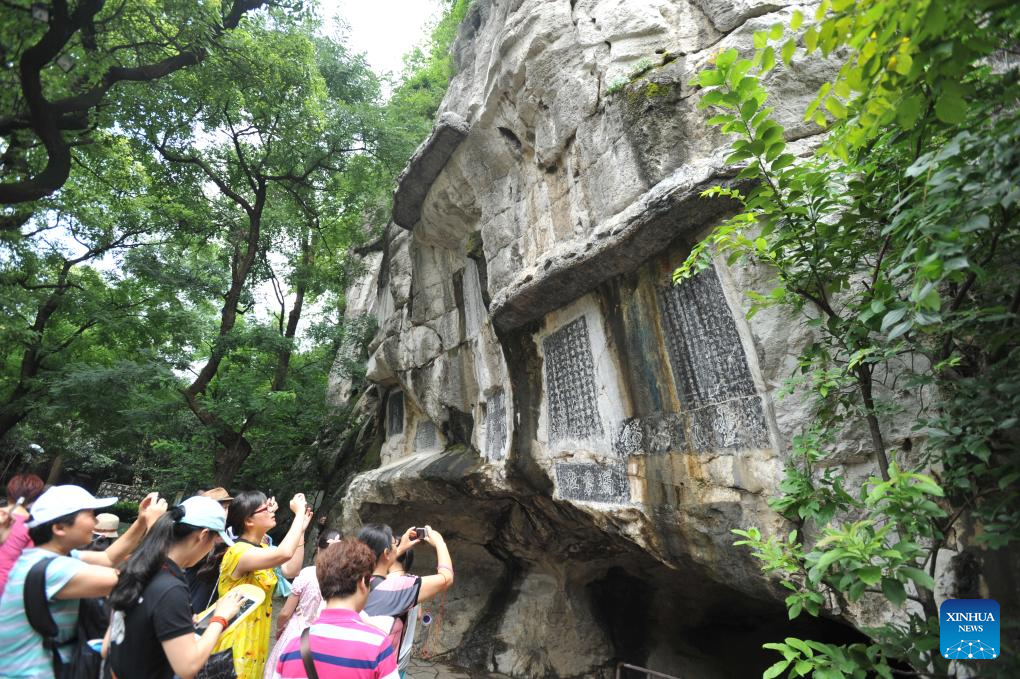 Tourists take photos of rock carvings at the Duxiu Feng (Solitary Beauty Peak) scenic area in Guilin, south China's Guangxi Zhuang Autonomous Region, June 29, 2014. Guilin, renowned for its breathtaking karst landscape, is one of China's most iconic destinations. Nestled in the Guangxi Zhuang Autonomous Region, Guilin is celebrated for its stunning natural beauty, with limestone peaks and serene rivers that attract visitors from around the world. Its unique topography and vibrant culture make it a cornerstone of Chinese tourism.