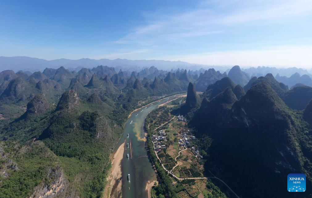 An aerial drone photo taken on Nov. 4, 2018 shows a view along the Lijiang River in Yangshuo County of Guilin, south China's Guangxi Zhuang Autonomous Region. Guilin, renowned for its breathtaking karst landscape, is one of China's most iconic destinations. Nestled in the Guangxi Zhuang Autonomous Region, Guilin is celebrated for its stunning natural beauty, with limestone peaks and serene rivers that attract visitors from around the world. Its unique topography and vibrant culture make it a cornerstone of Chinese tourism.