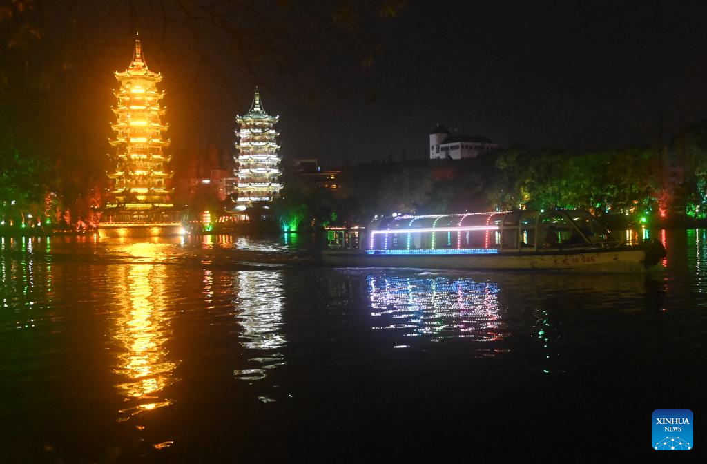 Tourists take a boat on the Ronghu Lake in Guilin, south China's Guangxi Zhuang Autonomous Region, March 12, 2025. Guilin, renowned for its breathtaking karst landscape, is one of China's most iconic destinations. Nestled in the Guangxi Zhuang Autonomous Region, Guilin is celebrated for its stunning natural beauty, with limestone peaks and serene rivers that attract visitors from around the world. Its unique topography and vibrant culture make it a cornerstone of Chinese tourism.