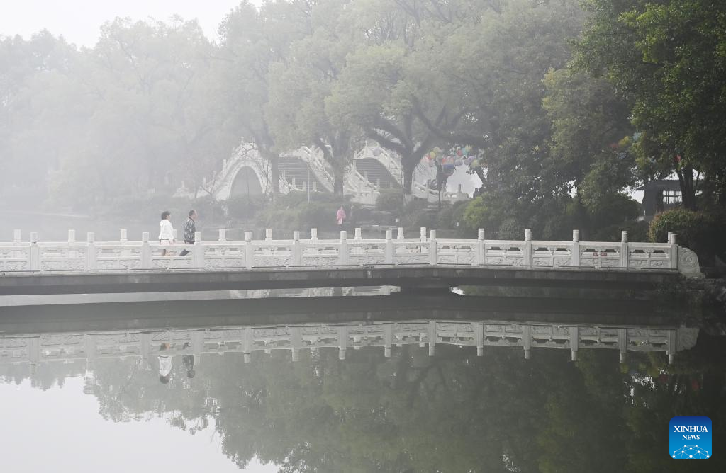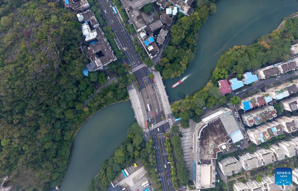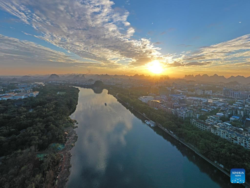 An aerial drone photo taken on Nov. 24, 2021 shows a view along the Lijiang River in Guilin, south China's Guangxi Zhuang Autonomous Region. Guilin, renowned for its breathtaking karst landscape, is one of China's most iconic destinations. Nestled in the Guangxi Zhuang Autonomous Region, Guilin is celebrated for its stunning natural beauty, with limestone peaks and serene rivers that attract visitors from around the world. Its unique topography and vibrant culture make it a cornerstone of Chinese tourism.