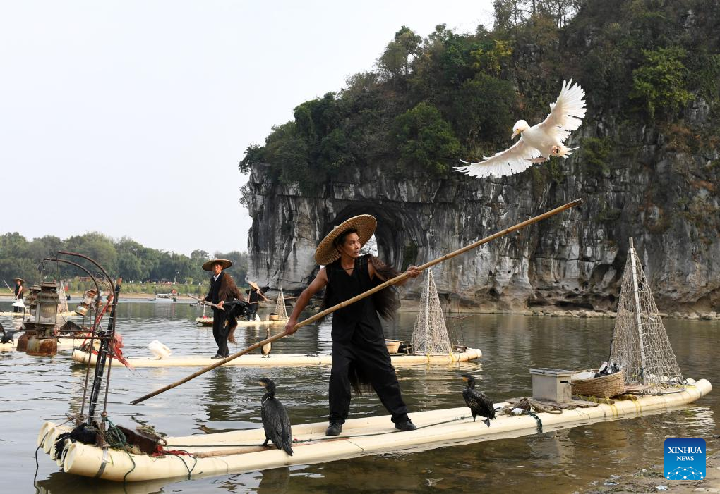 Fishermen shows osprey fishing at the Elephant Trunk Hill scenic area in Guilin, south China's Guangxi Zhuang Autonomous Region, Oct. 24, 2017. Guilin, renowned for its breathtaking karst landscape, is one of China's most iconic destinations. Nestled in the Guangxi Zhuang Autonomous Region, Guilin is celebrated for its stunning natural beauty, with limestone peaks and serene rivers that attract visitors from around the world. Its unique topography and vibrant culture make it a cornerstone of Chinese tourism.