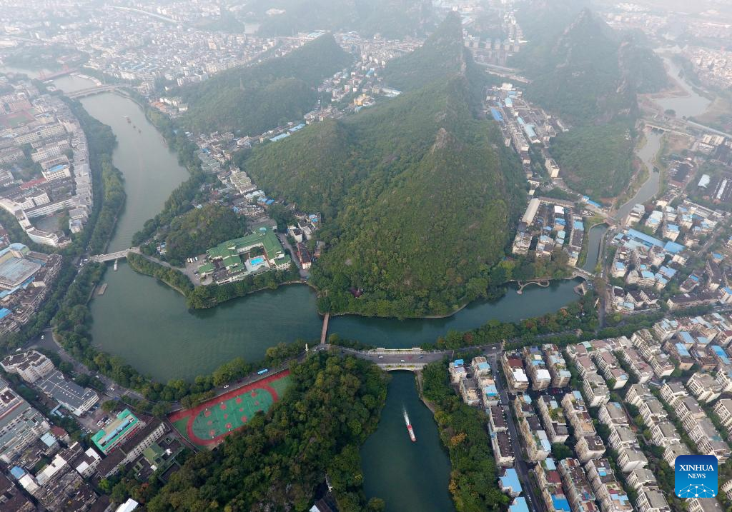 An aerial drone photo taken on Oct. 17, 2018 shows a view in Guilin, south China's Guangxi Zhuang Autonomous Region. Guilin, renowned for its breathtaking karst landscape, is one of China's most iconic destinations. Nestled in the Guangxi Zhuang Autonomous Region, Guilin is celebrated for its stunning natural beauty, with limestone peaks and serene rivers that attract visitors from around the world. Its unique topography and vibrant culture make it a cornerstone of Chinese tourism.