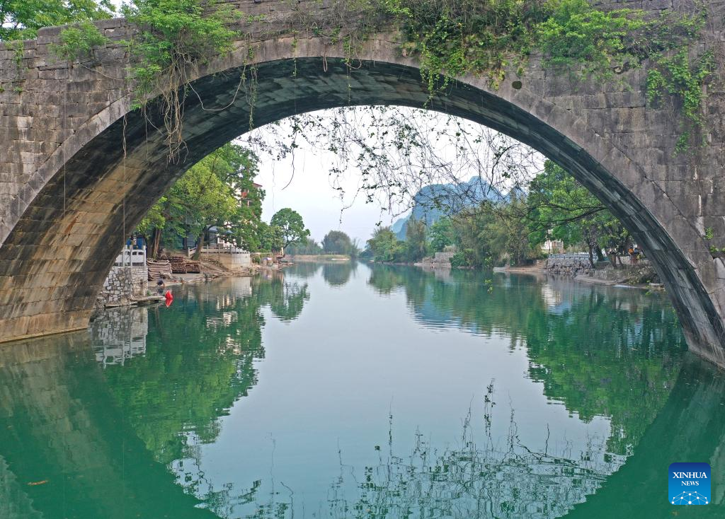 A drone photo taken on April 11, 2022 shows a view of the Yulong River in Yangshuo County of Guilin, south China's Guangxi Zhuang Autonomous Region. Guilin, renowned for its breathtaking karst landscape, is one of China's most iconic destinations. Nestled in the Guangxi Zhuang Autonomous Region, Guilin is celebrated for its stunning natural beauty, with limestone peaks and serene rivers that attract visitors from around the world. Its unique topography and vibrant culture make it a cornerstone of Chinese tourism.