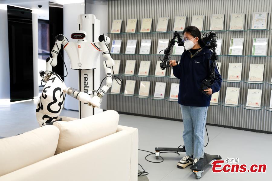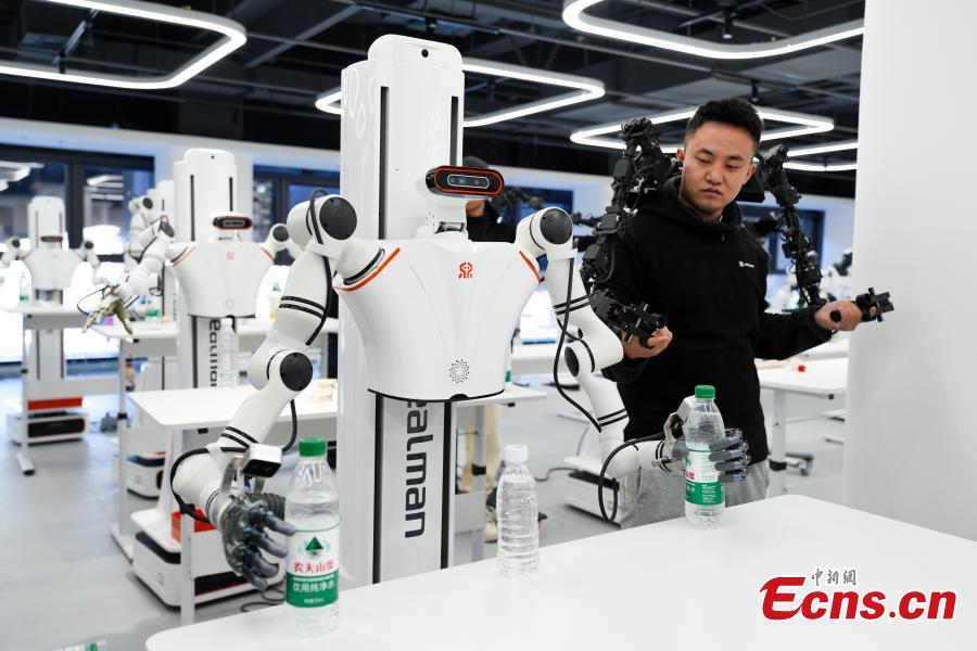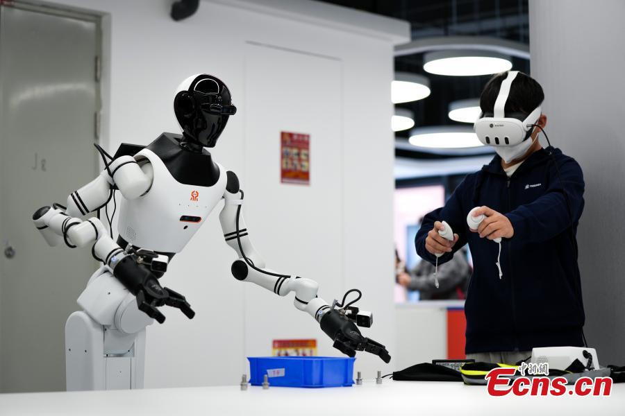 A staff member trains a humanoid robot at the humanoid robot innovation center at Shougang Park in Beijing, March 27, 2025. (China News Service/Zhang Xiangyi)