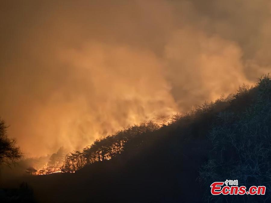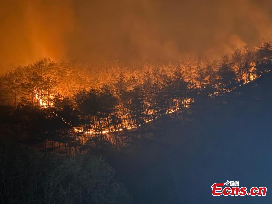 Smoke rises from a wildfire at a national park in Cheongsong County, North Gyeongsang Province, South Korea, March 27, 2025. (China News Service/Liu Xu)