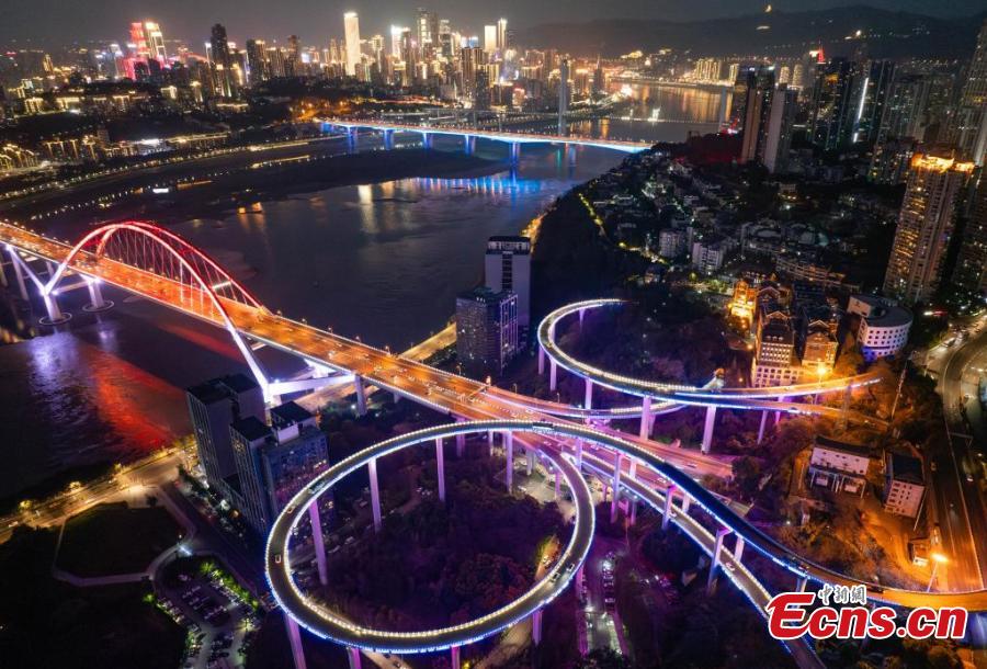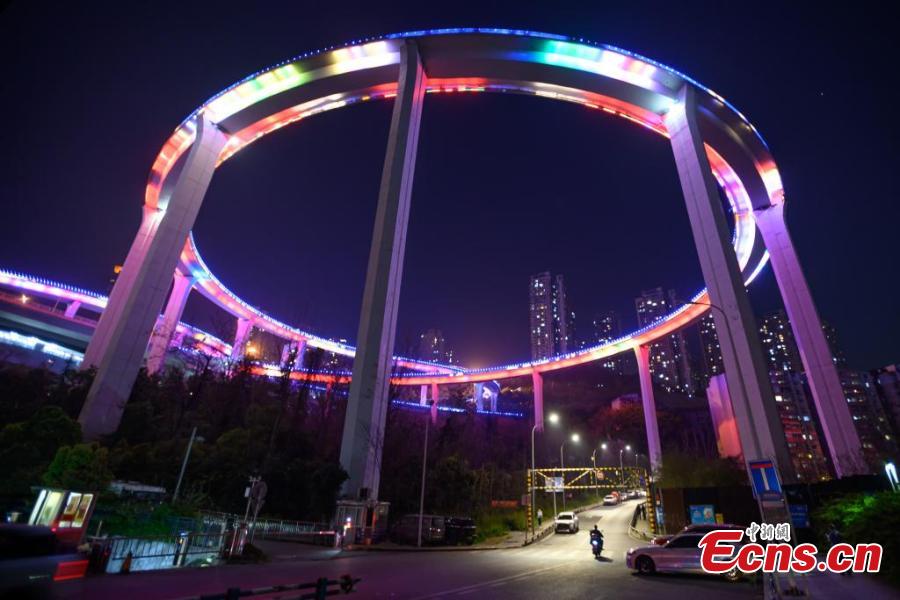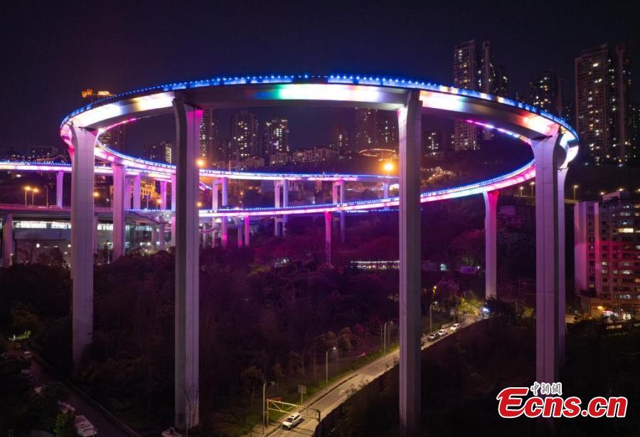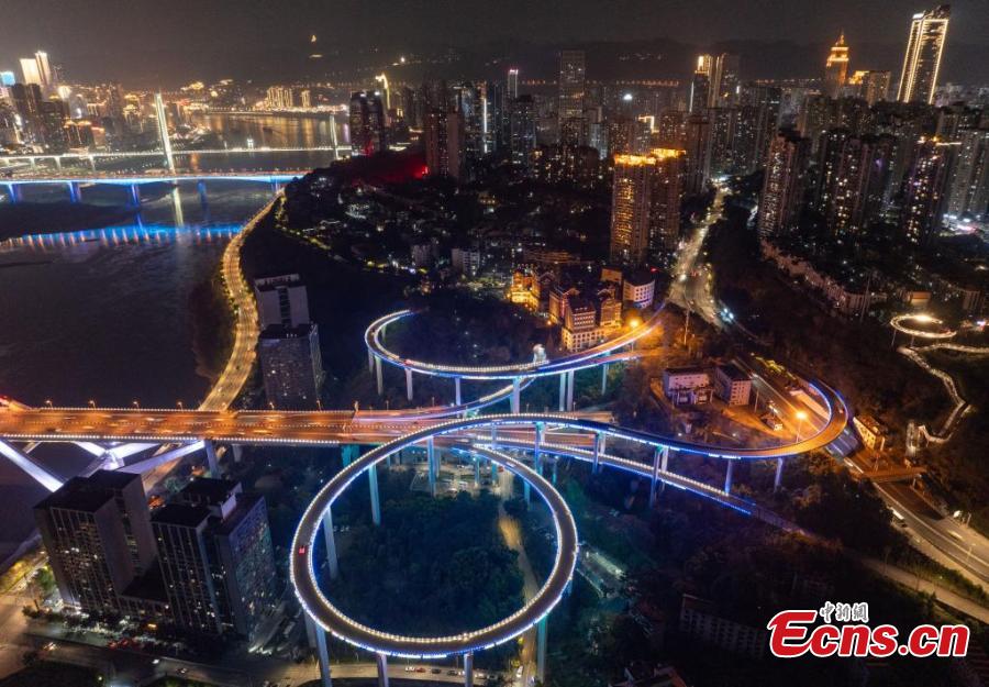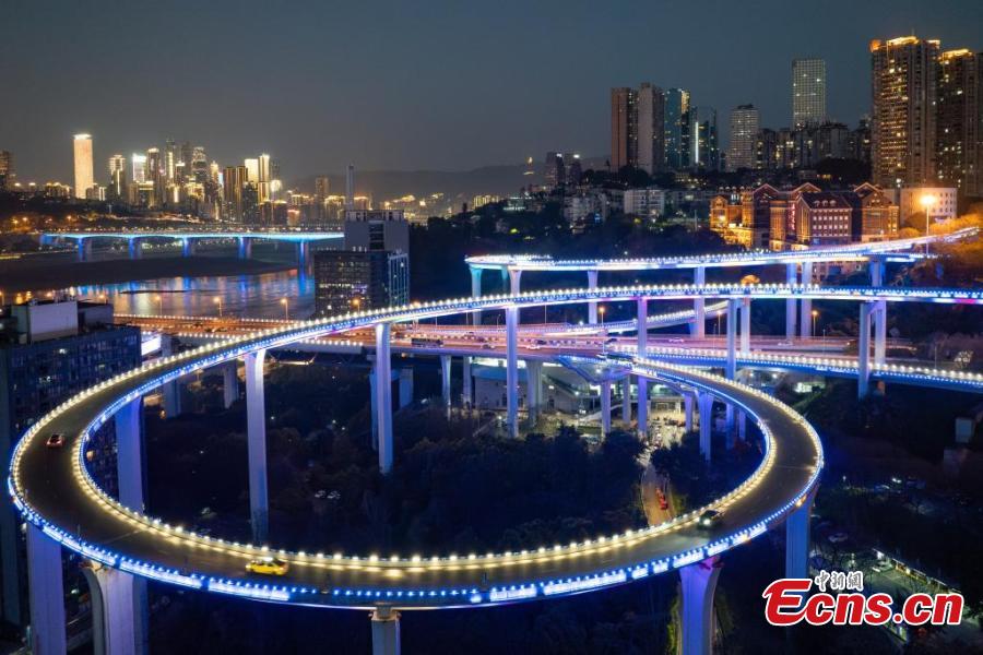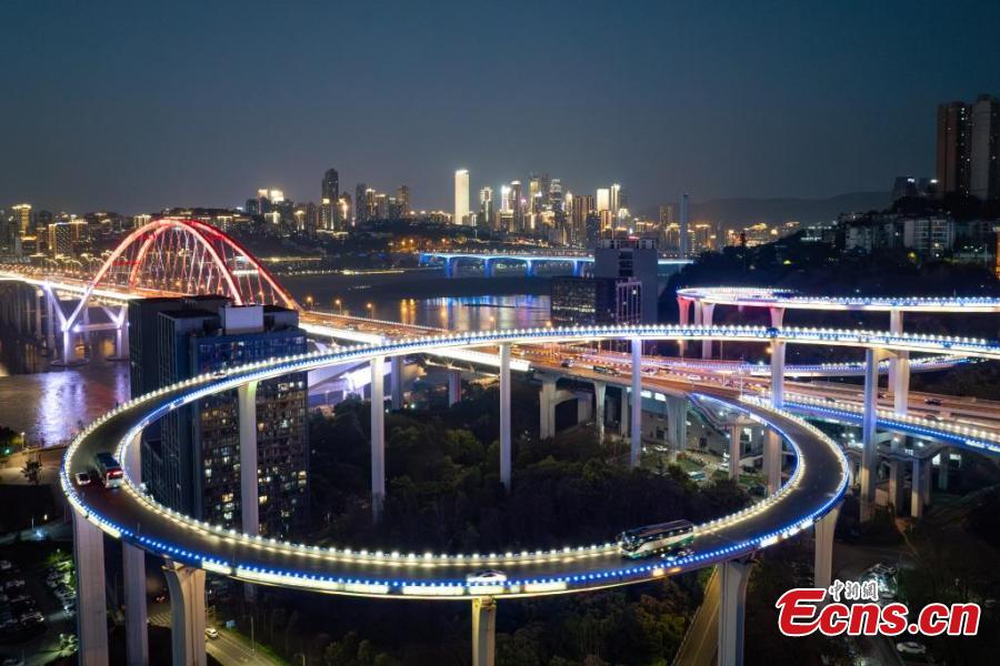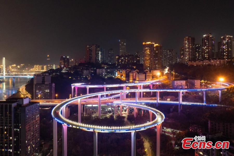 Sunning night view of the winding Sujiaba Overpass with a height of 72 meters connecting the north side of the Caiyuanba Bridge in Chongqing, March 26, 2025. (China News Service/He Penglei)