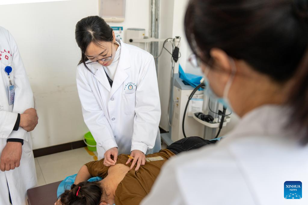 Duan Jing, a traditional Chinese medicine rehabilitation doctor from Shenzhen, demonstrates acupuncture treatment to local doctors at a hospital in Taxkorgan Tajik Autonomous County, northwest China's Xinjiang Uygur Autonomous Region, March 25, 2025. (Xinhua/Xu Hongyan)