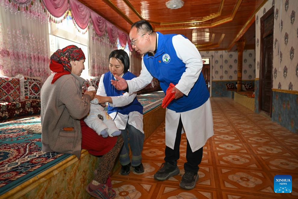 Pan Qian (C) and Xu Linsen (R), doctors from Shenzhen, examine a baby in Wayaoben Village of Kukexiluge Township, Taxkorgan Tajik Autonomous County, northwest China's Xinjiang Uygur Autonomous Region, March 24, 2025. (Xinhua/Hu Huhu)