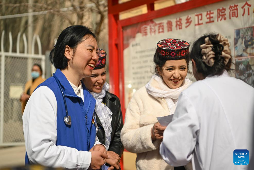 Pan Qian (1st L), a doctor from Shenzhen, talks with villagers and local medical staff at Kukexiluge health center in Kukexiluge Township, Taxkorgan Tajik Autonomous County, northwest China's Xinjiang Uygur Autonomous Region, March 24, 2025. (Xinhua/Hu Huhu)