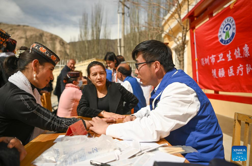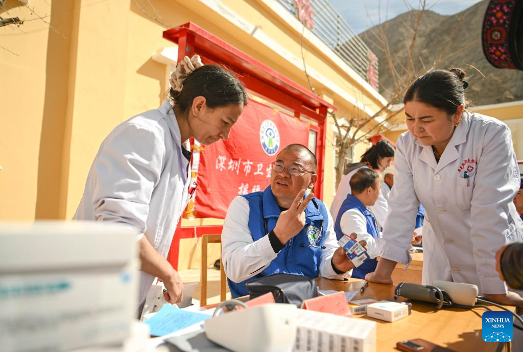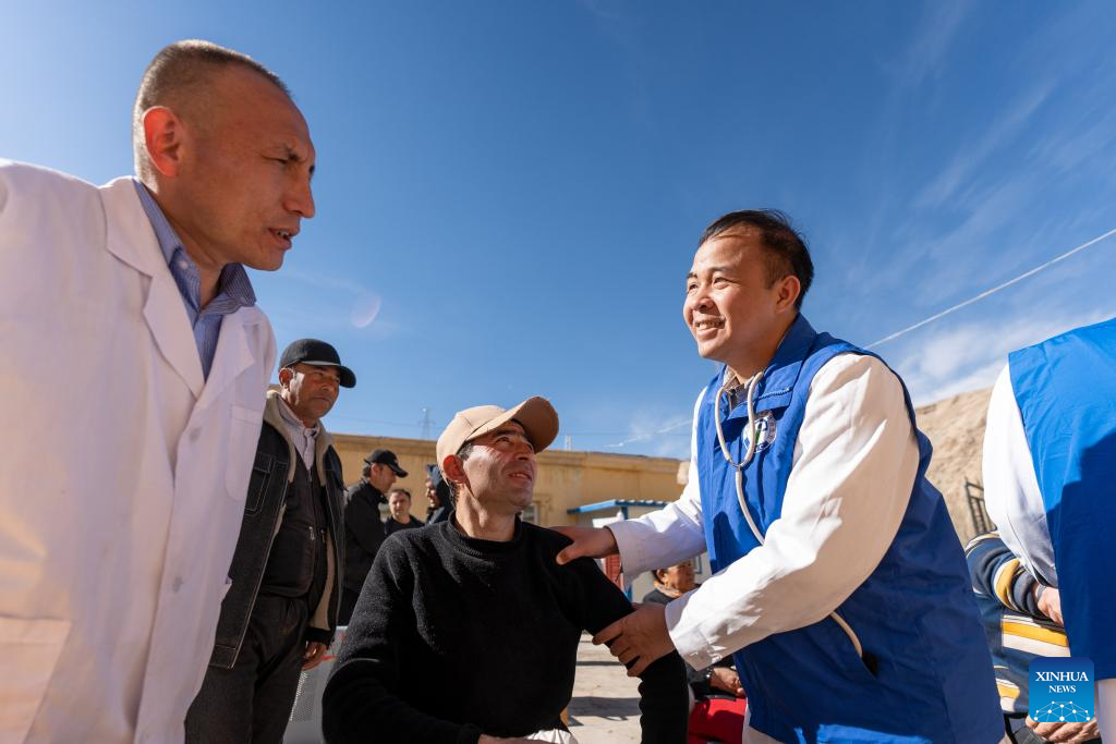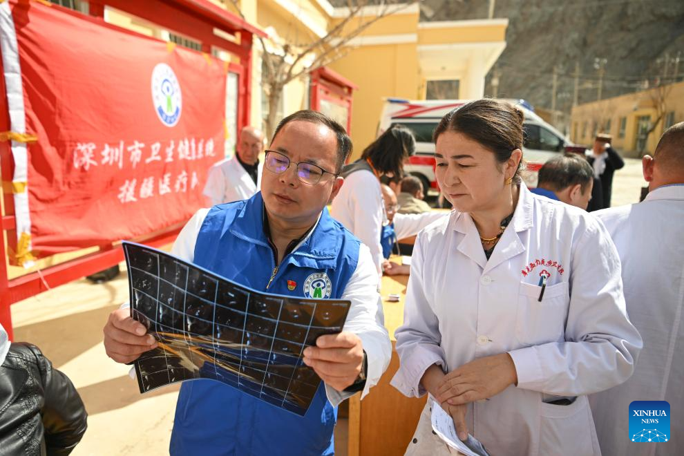 Liu Jinhuang (1st R), a doctor from Shenzhen, examines a villager at Kukexiluge health center in Kukexiluge Township, Taxkorgan Tajik Autonomous County, northwest China's Xinjiang Uygur Autonomous Region, March 24, 2025. (Xinhua/Xu Hongyan)
