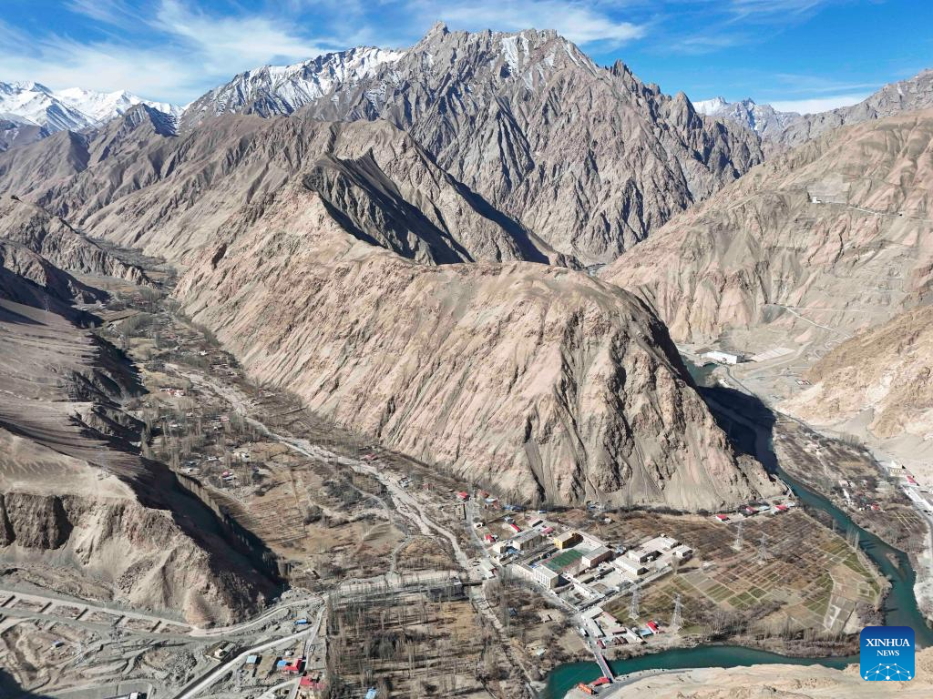 An aerial drone photo taken on March 24, 2025 shows Kukexiluge health center and nearby villages in Kukexiluge Township, Taxkorgan Tajik Autonomous County, northwest China's Xinjiang Uygur Autonomous Region. (Xinhua/Hu Huhu)