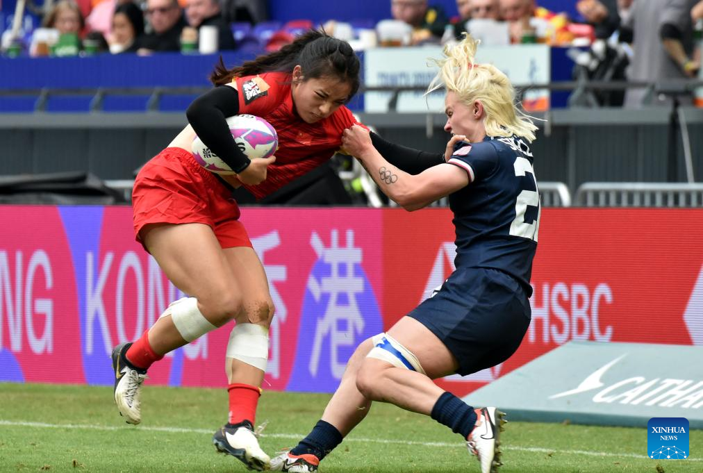 China's Jiang Yutong (2nd L) vies with Kristi Kirshe (C) of the United States during the women's Pool A match between China and the United States at World Rugby Sevens Series 2025 in south China's Hong Kong, March 29, 2025. (Xinhua/Lo Ping Fai)