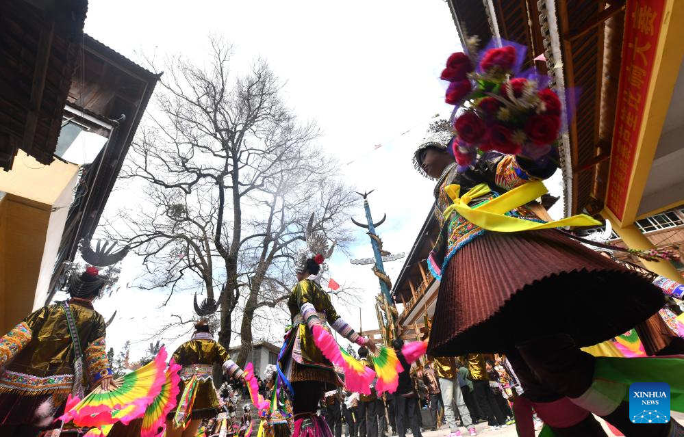 Villagers perform a traditional dance in Wuying Village on the border between south China's Guangxi Zhuang Autonomous Region and southwest China's Guizhou Province, Jan. 29, 2025. Since 2017, supported by a paired assistance program, local authorities have continuously enhanced the living environment and improved cultural facilities in Wuying Village, aiming to strengthen the inheritance and development of ethnic culture and promote rural revitalization. (Xinhua/Huang Xiaobang)