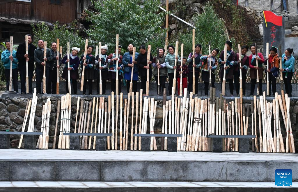 Villagers show their tools for making Liangbu, traditional hand-made cloth of Miao ethnic group, in Wuying Village on the border between south China's Guangxi Zhuang Autonomous Region and southwest China's Guizhou Province, Oct. 29, 2022. Since 2017, supported by a paired assistance program, local authorities have continuously enhanced the living environment and improved cultural facilities in Wuying Village, aiming to strengthen the inheritance and development of ethnic culture and promote rural revitalization. (Xinhua/Huang Xiaobang)