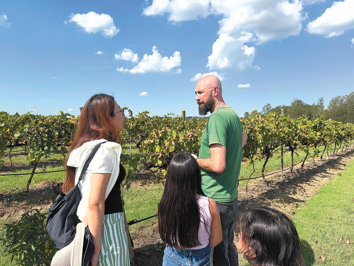 Nick Williams, the Hungerford Hill's cellar door operations manager, introduces wine knowledge to Chinese tourists in the vineyards of the Hunter Valley, Australia, in March. (Xin Xin/China Daily)