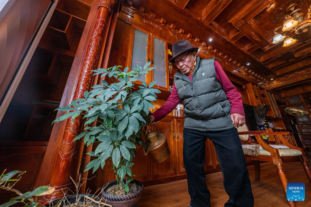 Losang waters a plant at home in Doilungdeqen District of Lhasa, southwest China's Xizang Autonomous Region, March 20, 2025. (Xinhua/Tenzin Nyida)